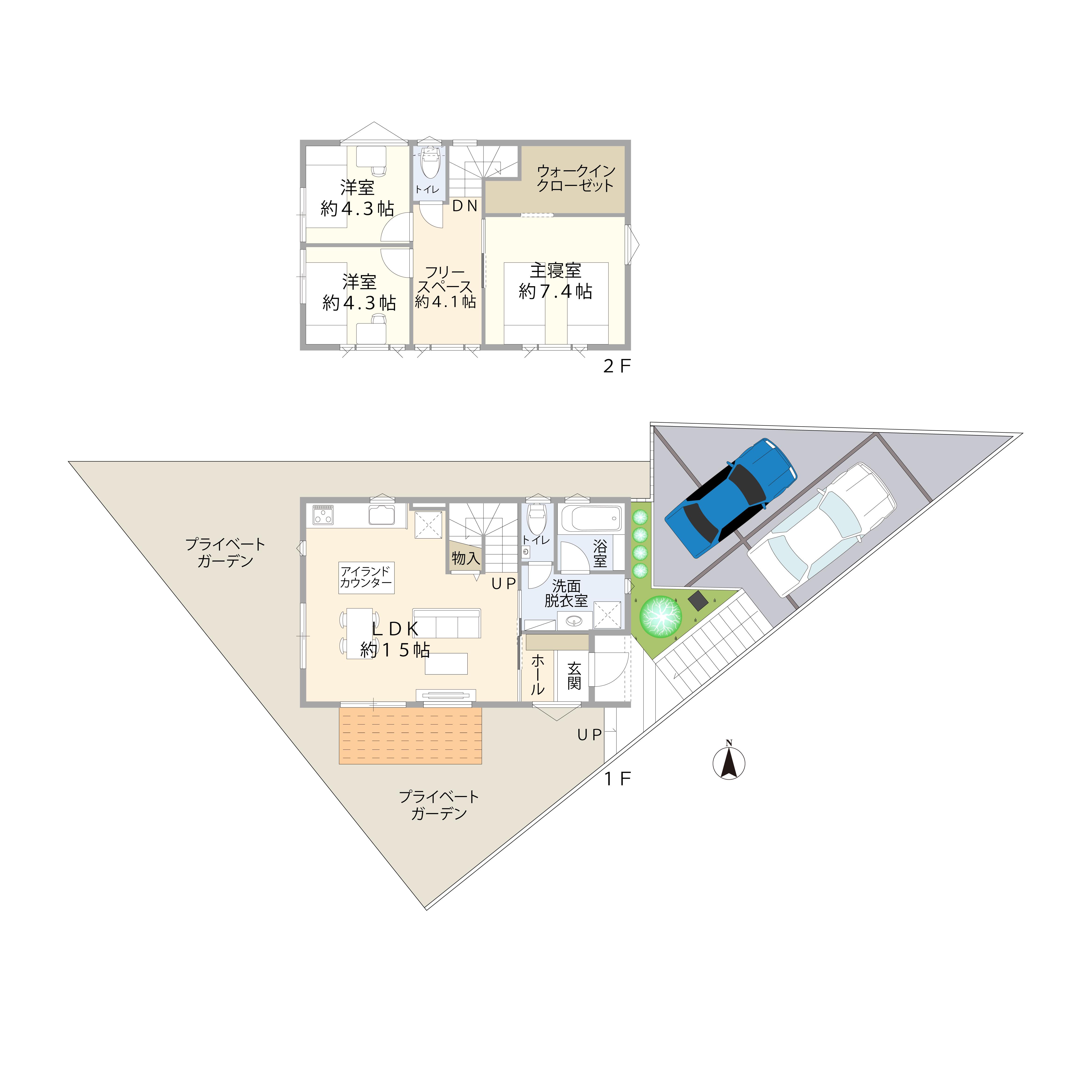 エアコン2台・宅配ボックス・食洗器・IHクッキングヒーター・オリジナルアイランドカウンター・全室照明・ウォークインクローゼット・人工木材デッキ・フェンス・駐車スペース土間コンクリート