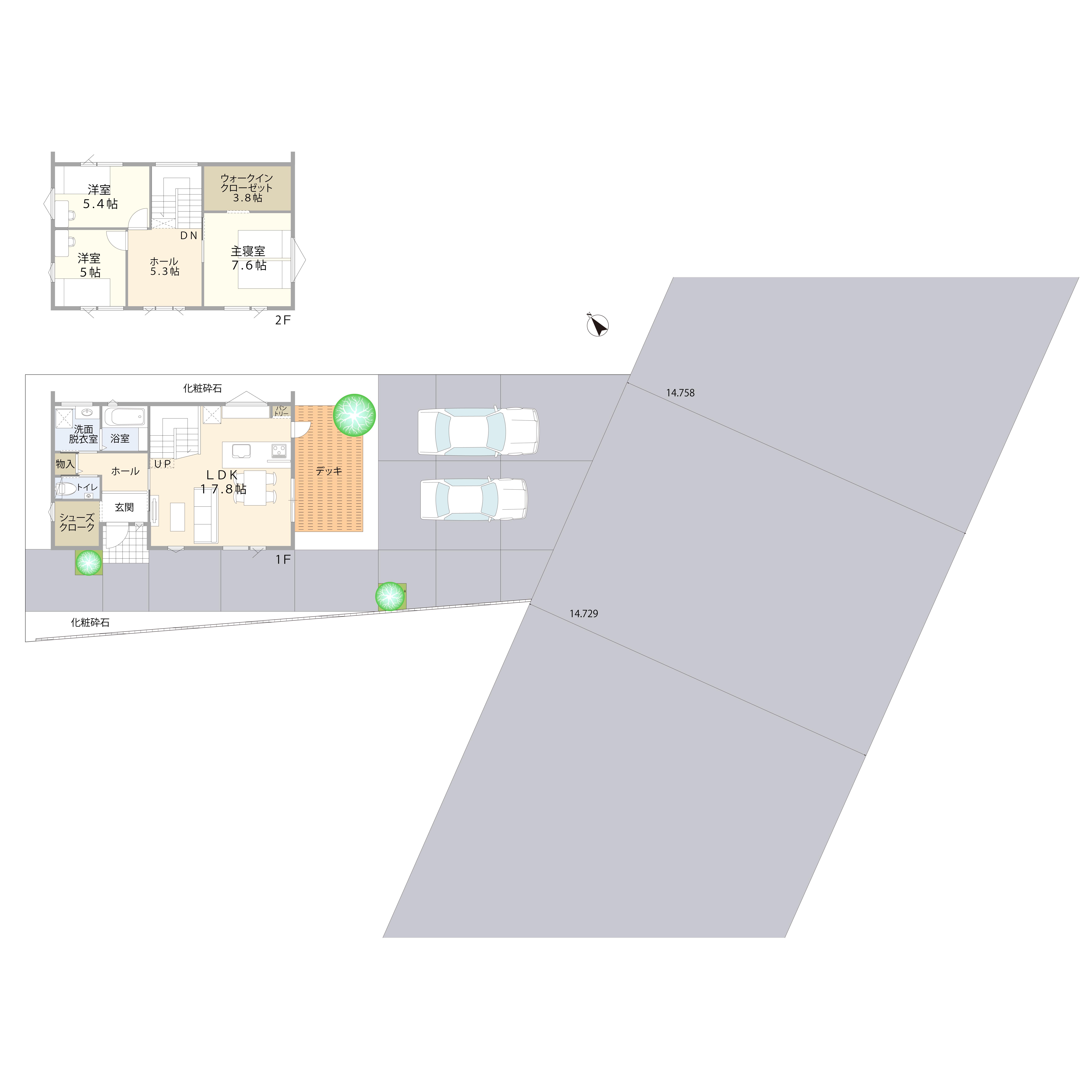 1F面積 49.29㎡(14.91坪) 2F面積 48.02㎡(14.52坪) 延床面積 97.31㎡(29.43坪) |